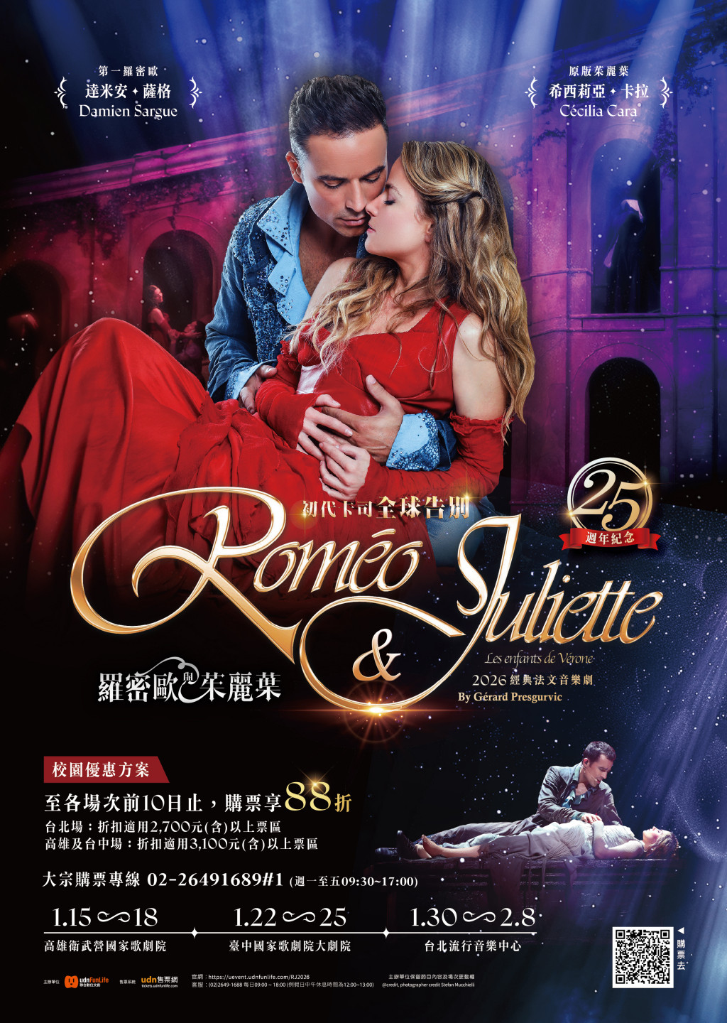 一、經典法文音樂劇《羅密歐與茱麗葉》自2001年在巴黎首演即轟動全球,以磅礴動人的音樂、現代感十足的編舞與都市巴洛克風格美學,重新詮釋莎士比亞經典悲劇,劇中更以紅與藍兩大色系象徵家族對峙,展現強烈視覺張力;而初代卡司的演出早已成為大眾心中難以取代的記憶,本次適逢音樂劇25周年同時也是初代卡司告別巡演,讓這次在台灣的演出更具紀念性。法文音樂劇以獨樹一格的「演唱會」形式製作打造,特別強調「音樂」與「演員魅力」,以「歌」帶「戲」是法式音樂劇製作的順序與模式,藉由歌曲詠唱以及雋永詞彙的表達,再加上多樣化背景音樂襯托,讓演員的情緒起伏及情感傳遞更加深刻。誠摯推薦師生前來觀賞國際級精彩演出,並藉此增進對各類表演類型的了解。