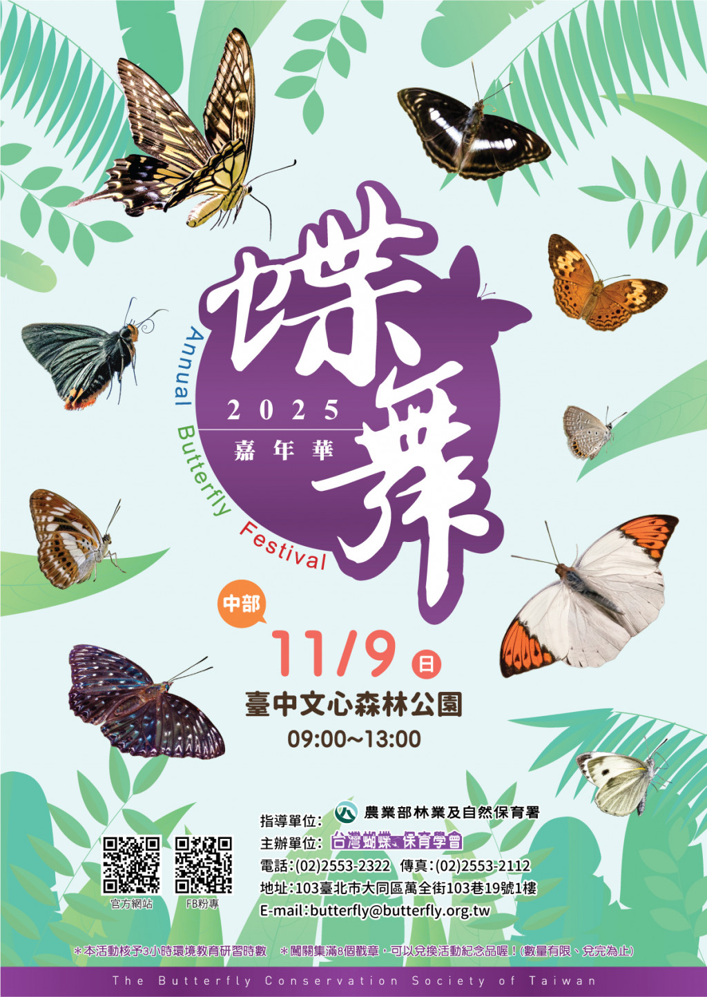 | 二、 | 114年11月09日於文心森林公園(捷運站出口旁)舉行「2025蝶舞嘉年華」大型環境教育推廣活動,公文附件為文宣海報,敬請張貼公告週知並鼓勵老師和學生踴躍參加。 |