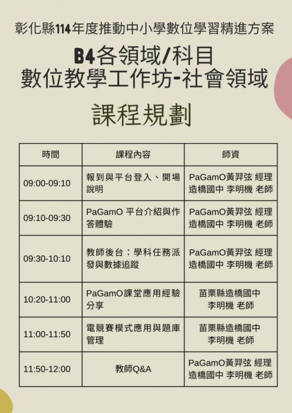 彰化縣政府辦理114年度「B4各領域/科目、議題數位教學工作坊 社會及數學」,請轉知貴校教師踴躍報名參加,並惠予公假登記,請查照