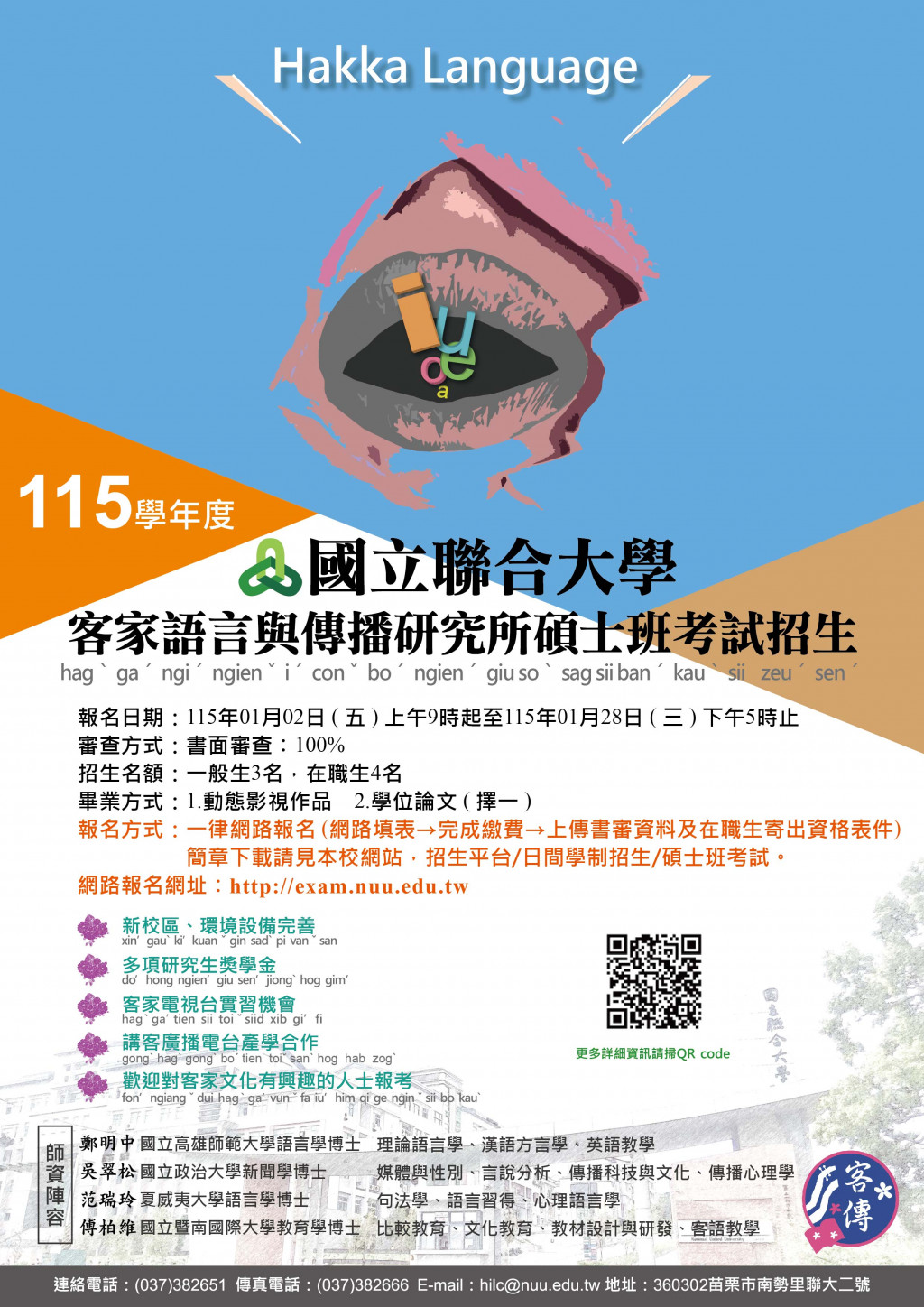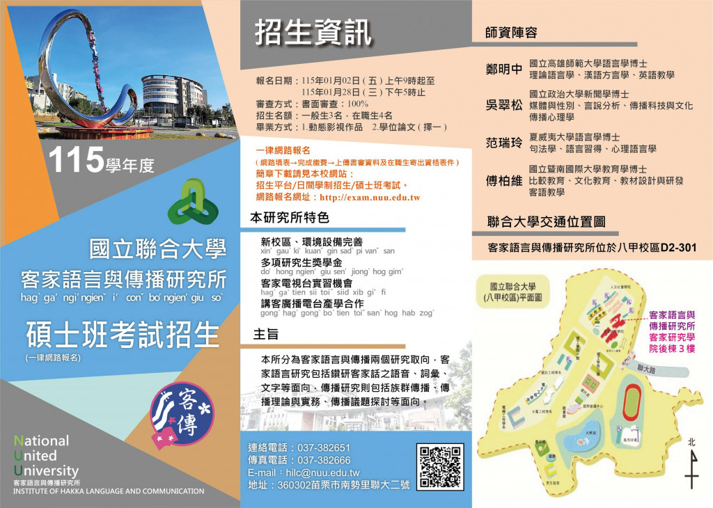 轉知國立聯合大學客家語言與傳播研究所115學年度碩士班考試招生資訊,請查照。
