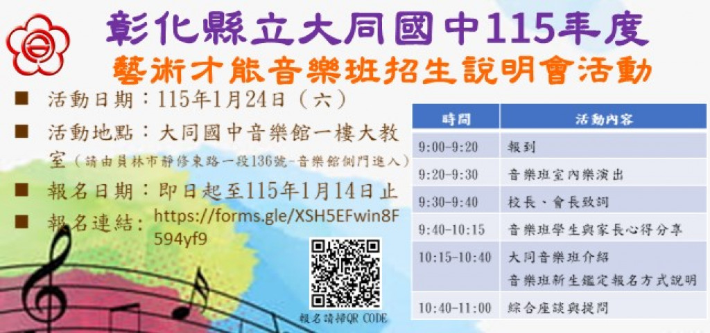 一、大同國中將於 115年1月24日(星期六)大同國中辦理 「大同國中115年藝術才能音樂班招生說明會活動」,懇請協助轉知貴校有 意報考的國小五、六年級學生及家長並鼓勵參加。本活動報名時間為即日起至 115年1月14日止 ,一律採google 表單進行線上報名,網址 : https://forms.gle/4xPPTLZ6Hmvh9Re5A。