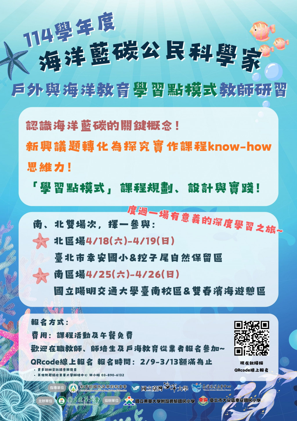 二、本研習以「淨零碳排」為主軸,聚焦海洋藍碳與戶外、海洋教育課程設計,透過專業講授與實地探究活動,提升教師於學習點模式課程規劃與教學實踐之專業知能。