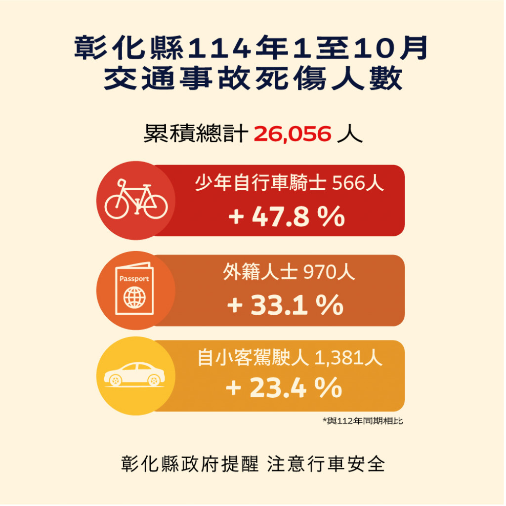 一、根據交通部道安資訊查詢網,本縣114年1-10月道路交通事故與112年同期比較分析,以少年自行車騎士(含電自、電輔) 事故增加47.8%最高,外籍人士事故增加33.1%次之,自小客車駕駛人增加23.4%再次之。1-10月份鄉鎮市30日死亡人數於「彰化市、員林市、二林鎮、鹿港鎮」為多,肇事熱點以「彰化市」為多,合先敘明。 |
