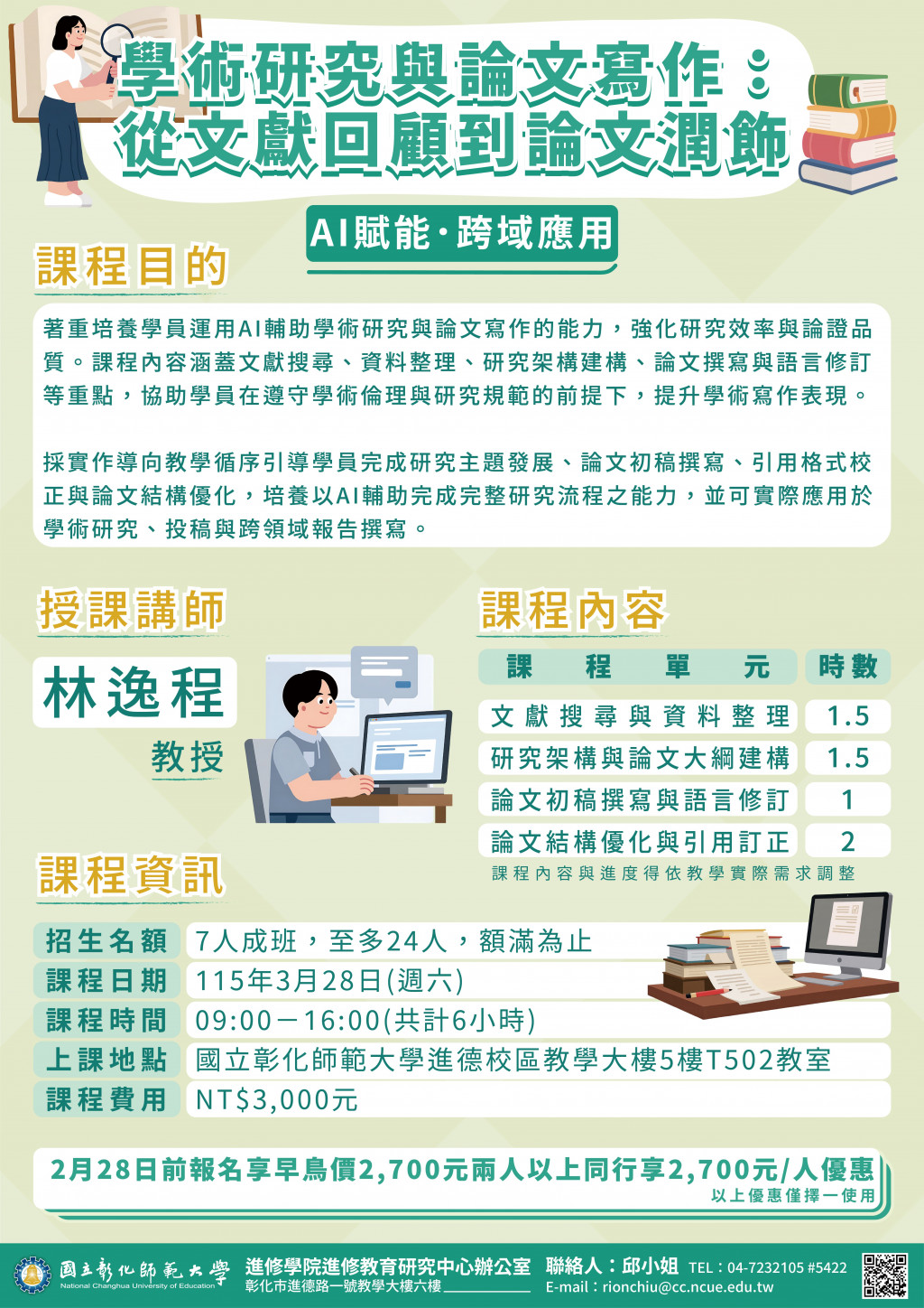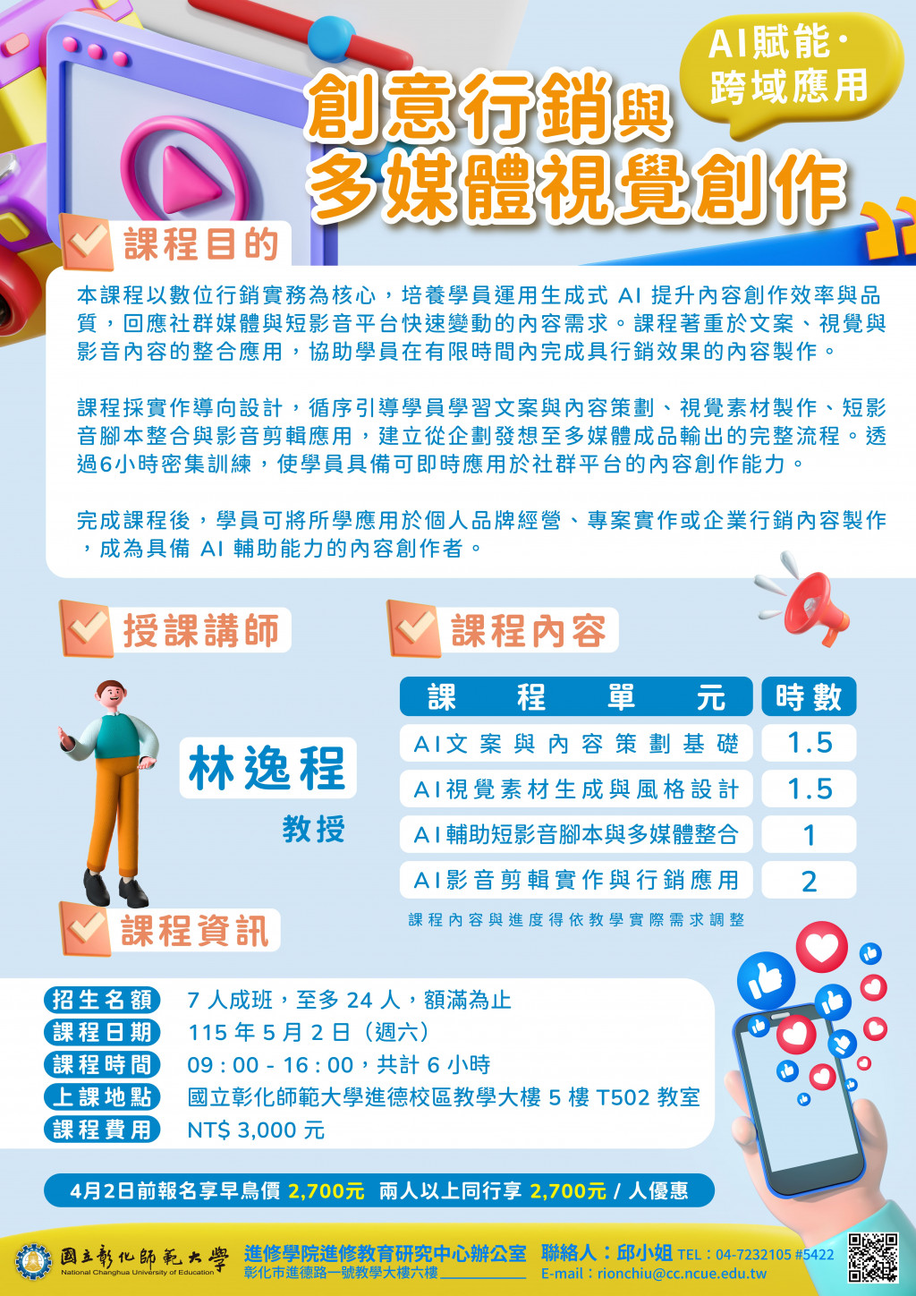 檢送國立彰化師範大學進修學院推廣教育課程「AI賦能-跨域應用:學術研究與論文寫作:從文獻回顧到論文潤飾」、「【AI賦能.跨域應用】創意行銷與多媒體視覺創作」課程簡章,敬請惠予公告。