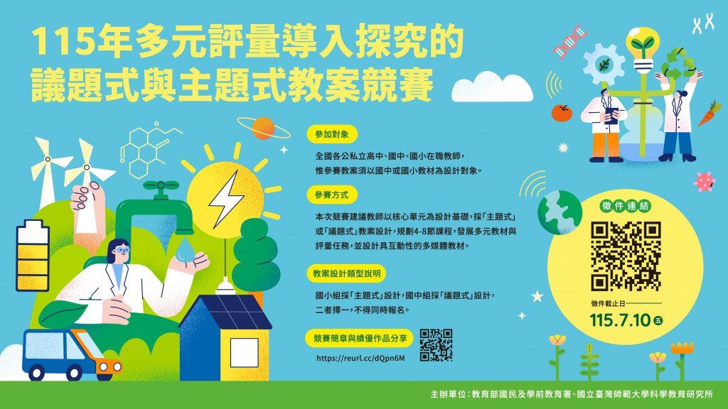 有關國立臺灣師範大學辦理教育部國民及學前教育署「多元評量導入探究的議題式與主題式教學教案」競賽徵稿,請轉知貴校相關教師踴躍報名參加,請查照。
