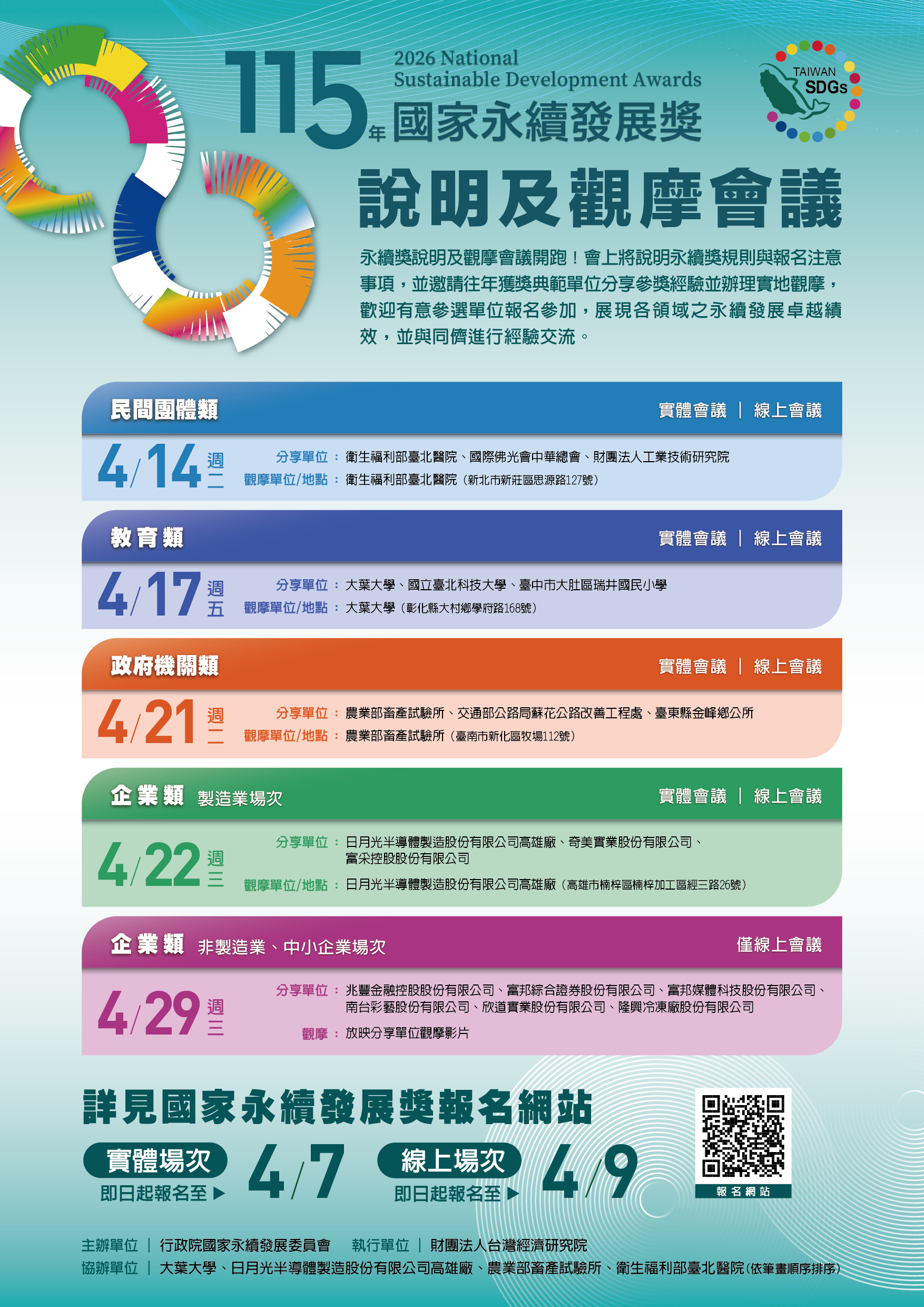 三、為增進各界對於國家永續發展獎之瞭解,並促進永續發展相關經驗互相交流與分享,該會另舉辦「115年國家永續發展獎說明及觀摩會議」共計5場次,均可免費線上報名,歡迎有意參加本年度國家永續發展獎選拔者踴躍參加,活動資訊請參考附件,活動資訊網址:https://gov.tw/XST)。