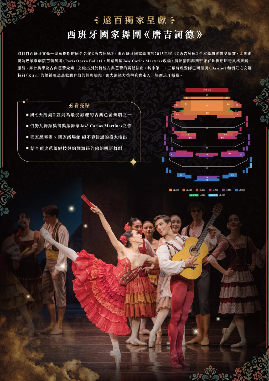 (二) 西班牙國家舞團自創立以來,歷經多位世界級藝術總監領軍,在古典與當代之間不斷拓展藝術疆界,兼具技術實力與文化深度。此次來台演出的《唐吉訶德》,更被視為舞團詮釋古典芭蕾語彙與西班牙民族精神的代表之作,充分體現其「以國家文化為根,與國際舞台對話」的藝術定位。
