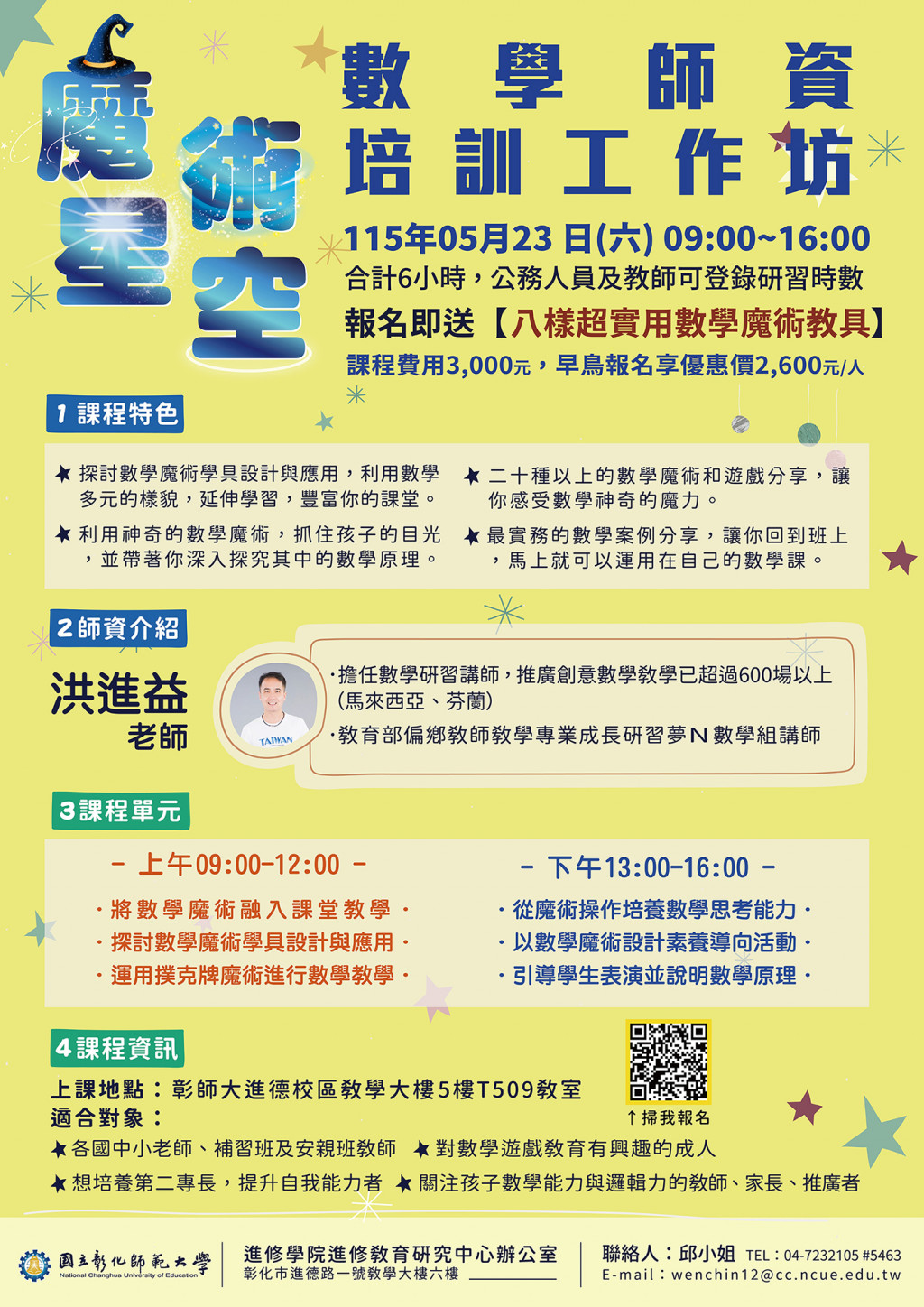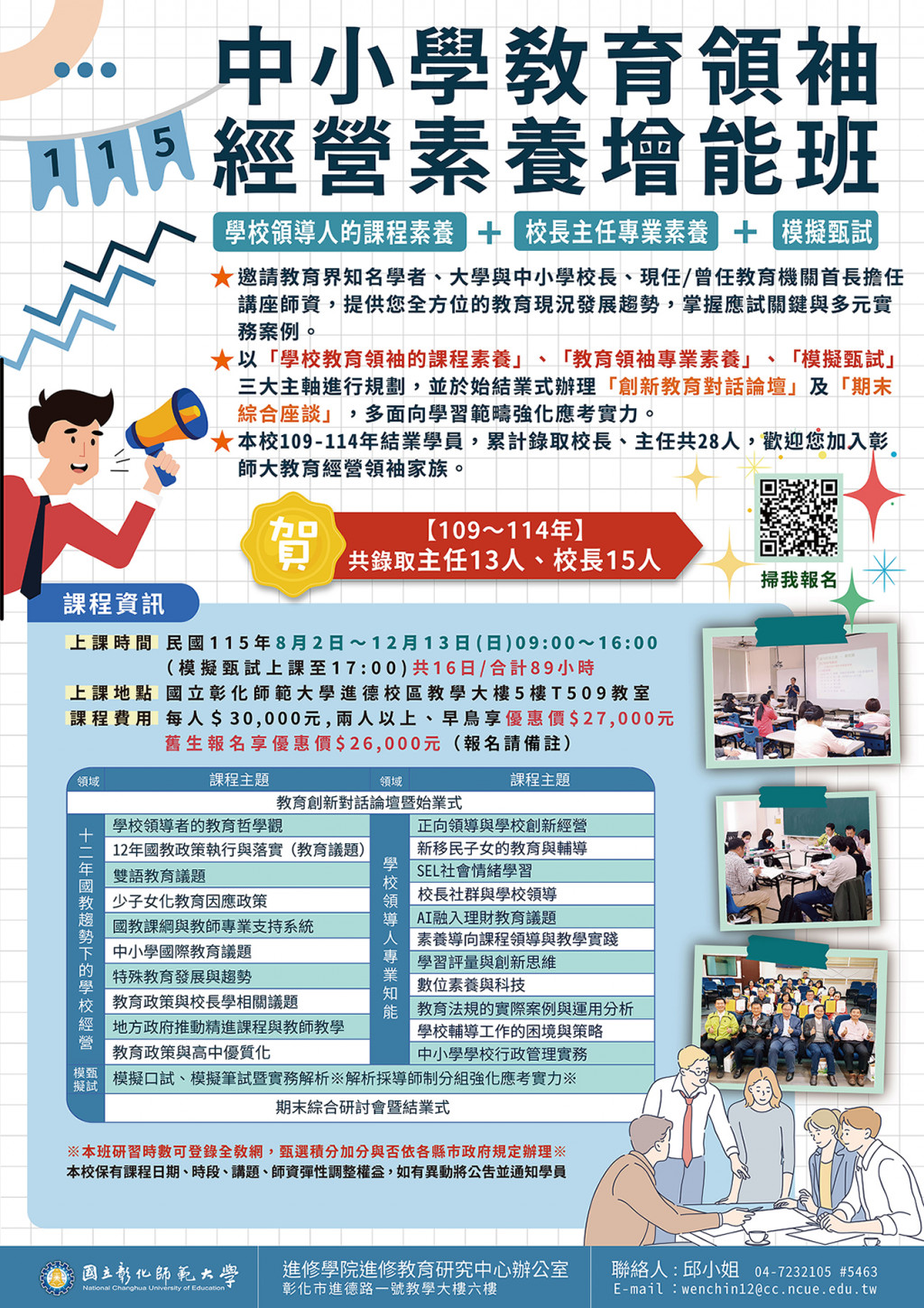 國立彰化師範大學進修學院推廣教育「魔術星空數學師資培訓工作坊」、「課後才藝安親照顧培訓師乙級鑑定輔導班」、「115年中小學教育領袖經營素養增能班」招生簡章,敬請惠予公告。