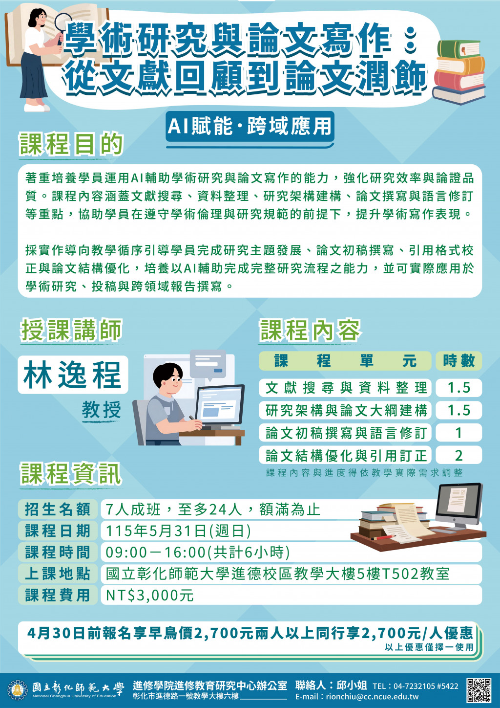 (三) 課程費用:3,000元,開課前1個月報名享早鳥價2,700元;兩人以上同行每人享2,700元優惠。以上優惠擇一使用,不可併用。【AI賦能.跨域應用】學術研究與論文寫作舊生另享優惠2,500元。