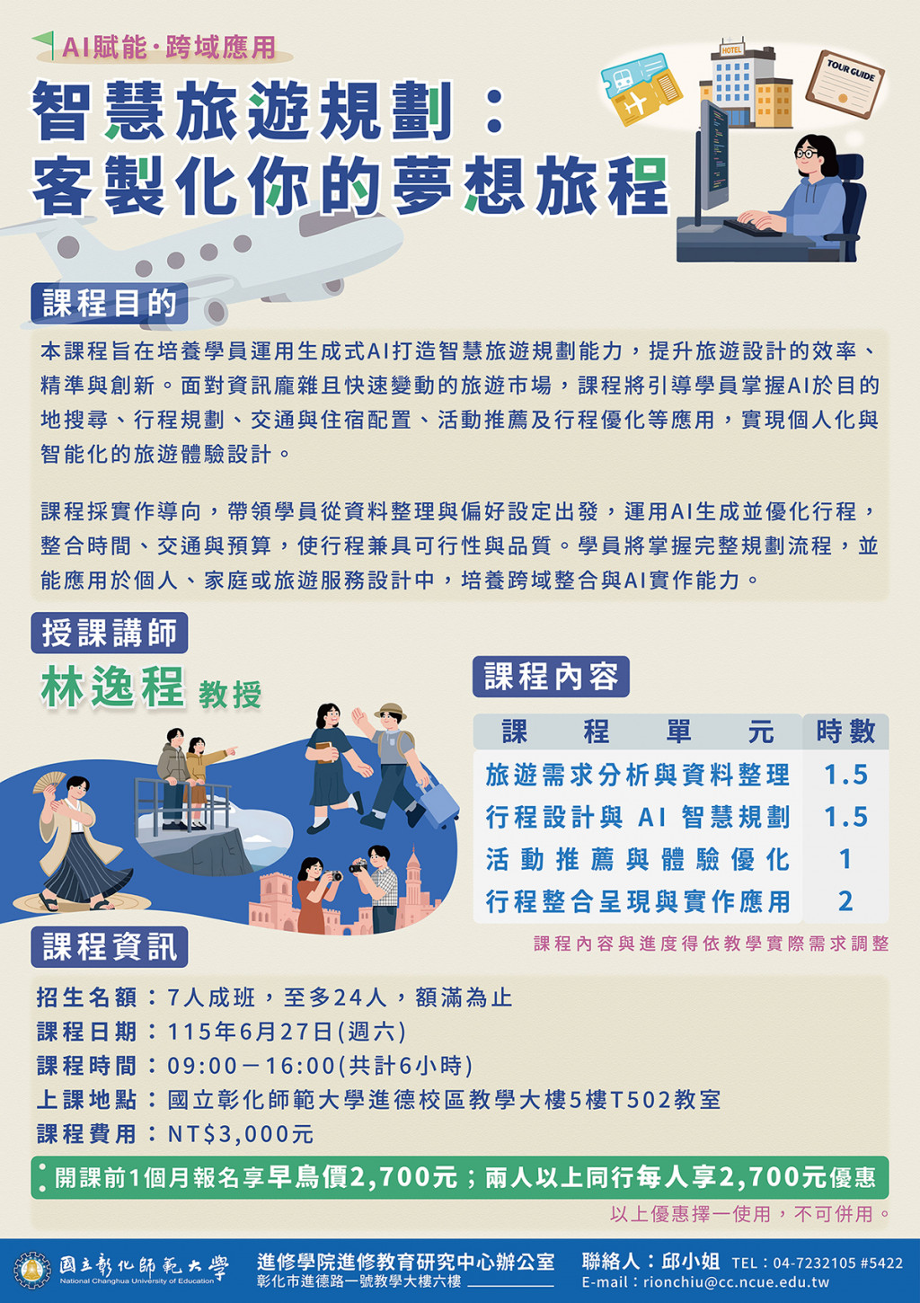 (一) 課程特色:課程採實作導向,運用AI生成並優化個人化旅遊行程,整合時間、交通、預算,培養完整規劃能力,並應用於個人或企業專案。