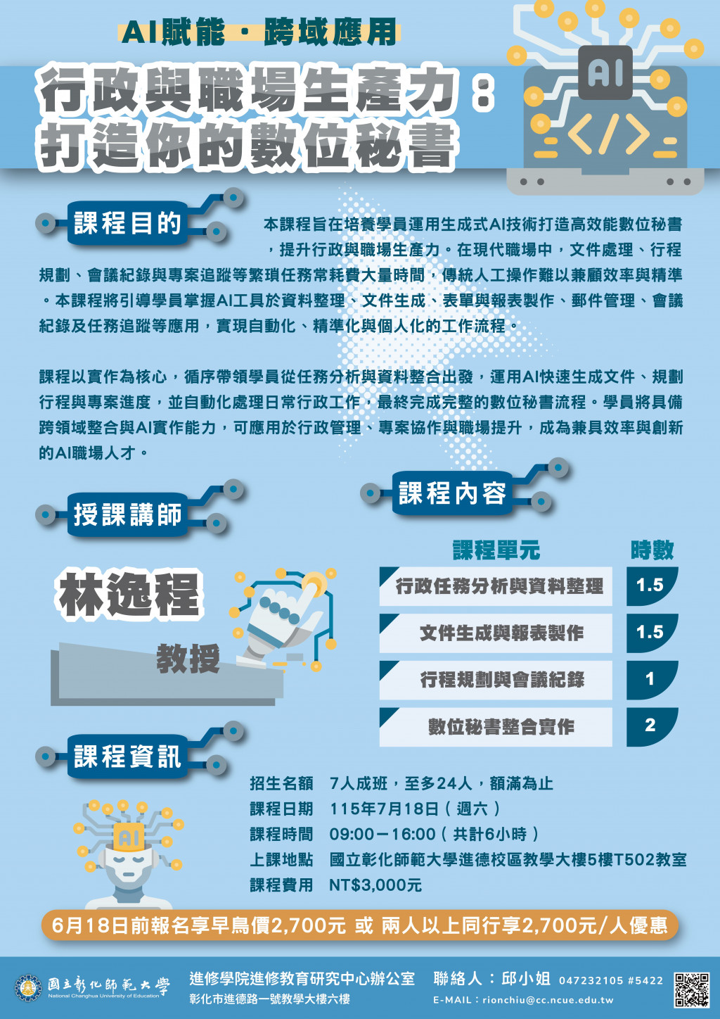 國立彰化師範大學進修學院推廣教育課程「【AI賦能.跨域應用】 學術研究與論文寫作:從文獻回顧到論文潤飾」、「【AI賦能.跨域應用】 智慧旅遊規劃:客製化你的夢想旅程」、「【AI賦能.跨域應用】 行政與職場生產力:打造你的數位秘書」課程簡章,敬請惠予公告。