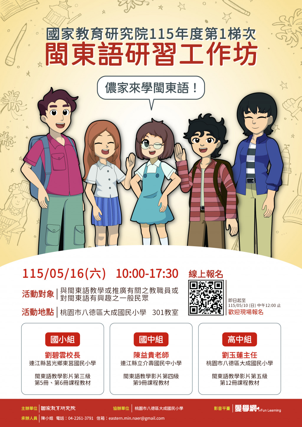 [類別] 標題 [11503852] 有關國家教育研究院辦理115年第1梯次「閩東語研習工作坊」活動,鼓勵教師或有興趣之人士踴躍參與,請查照。